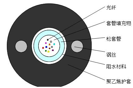GYXY光纜的結構是將250µm光纖套入高模量材料制成的松套管中,松套管內填充防水化合物。松套管外加阻水材料以保證光纜縱向阻水,兩側放置兩根平行鋼絲后擠制聚乙烯護套成纜。